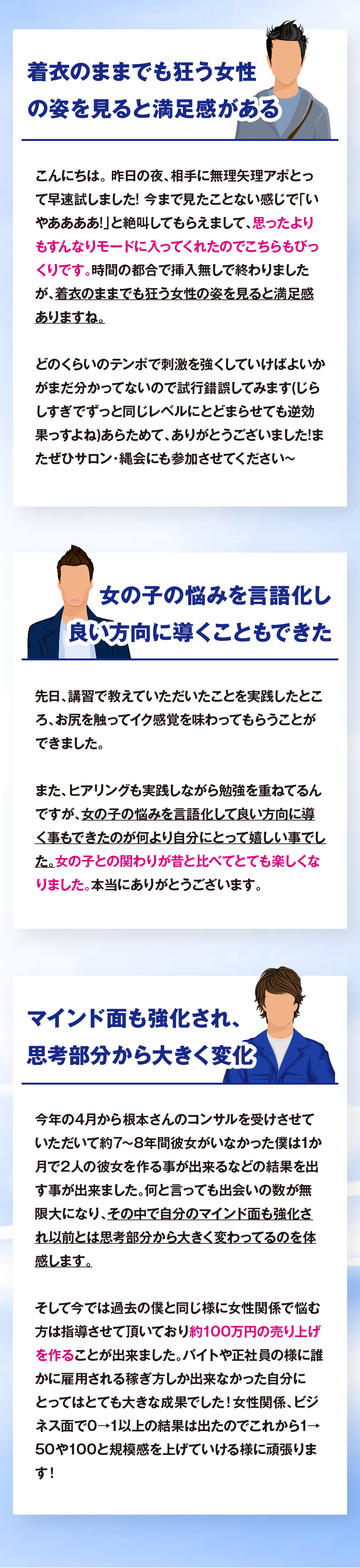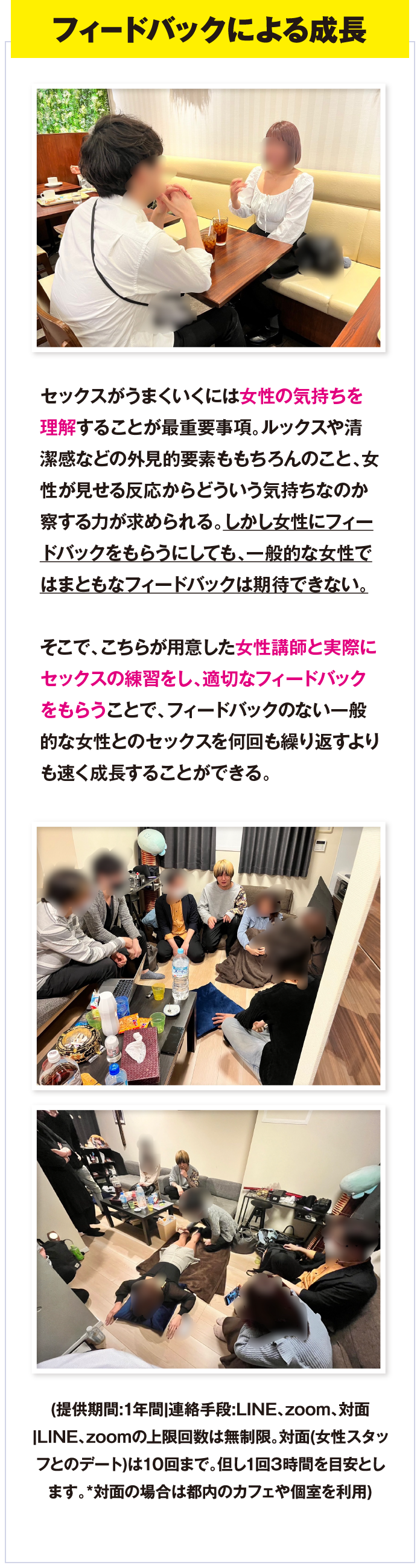 1000人を超える女性とセックスをしてきた知見を生かし、男女共に指導経験あり。特に女性からの依頼が多く、過去には1日に4件ものセックスをこなしていたことも。本妻に加え2人の妻と子供4人と暮らすセックスのスペシャリスト。